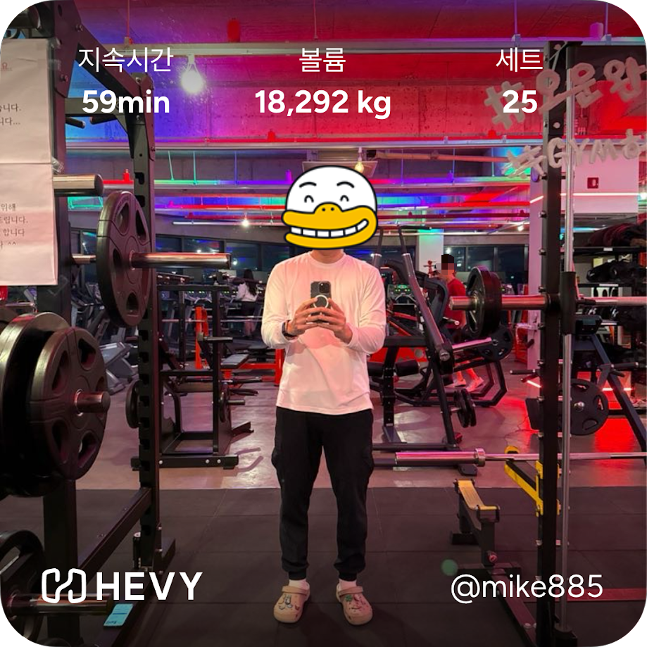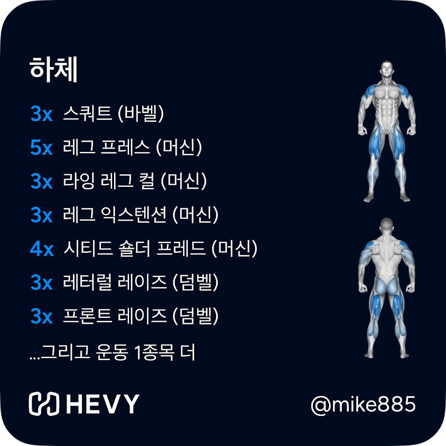 - 오늘의 루틴: 유산소 10분 - 스트레칭 - 바벨스쿼트 - 레그프레스 - 레그컬 - 레그 익스텐션 - 숄더프레스 - 레터럴 레이즈
